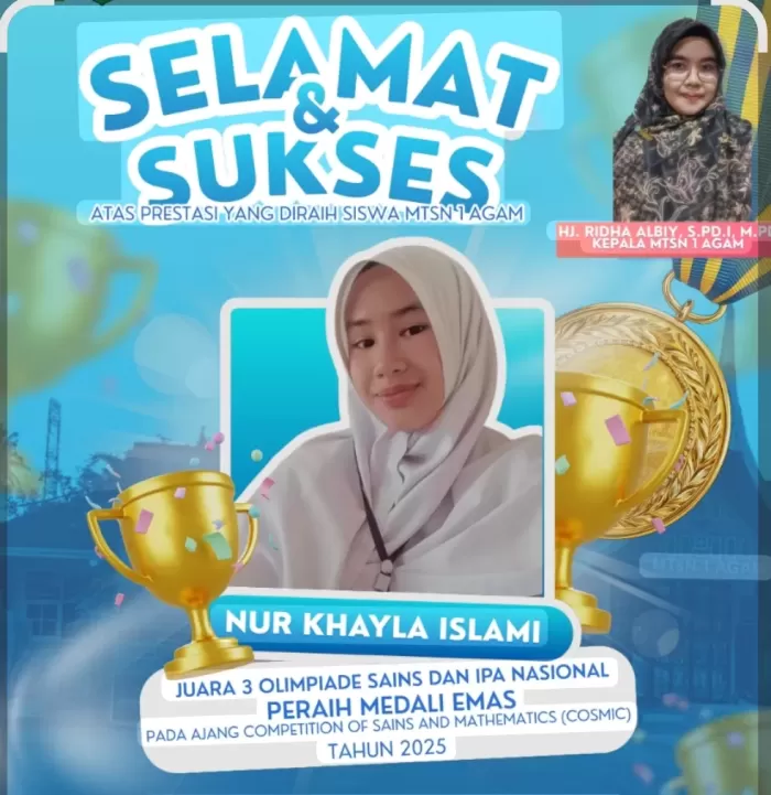“Alhamdulillah, kami sangat bersyukur dan bangga atas prestasi ananda Nur Khayla Islami. Ini adalah hasil dari kerja keras, kedisiplinan, serta doa bersama. Prestasi ini diharapkan dapat menjadi inspirasi bagi seluruh siswa MTsN 1 Agam untuk terus berusaha dan berprestasi di berbagai bidang,” ungkapnya.